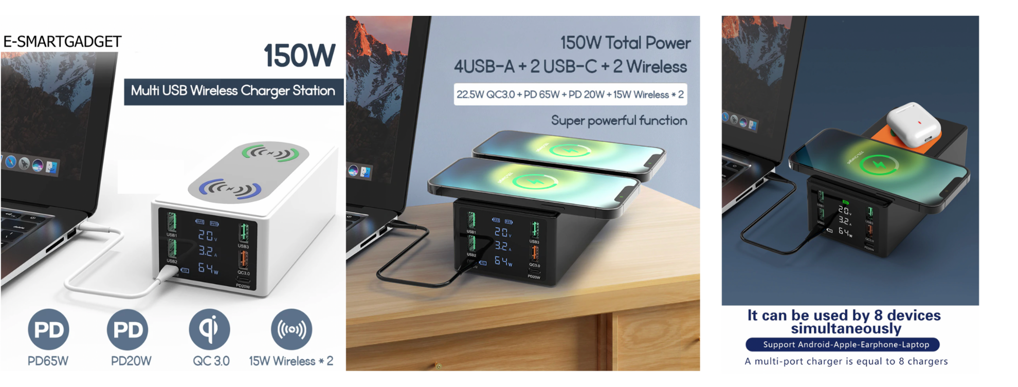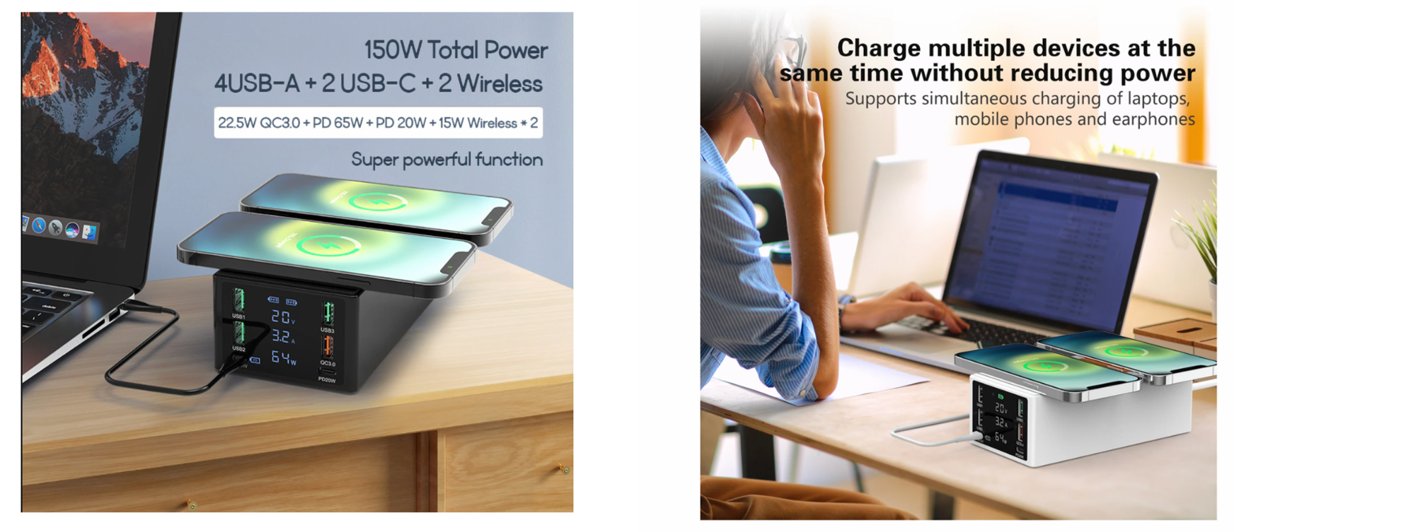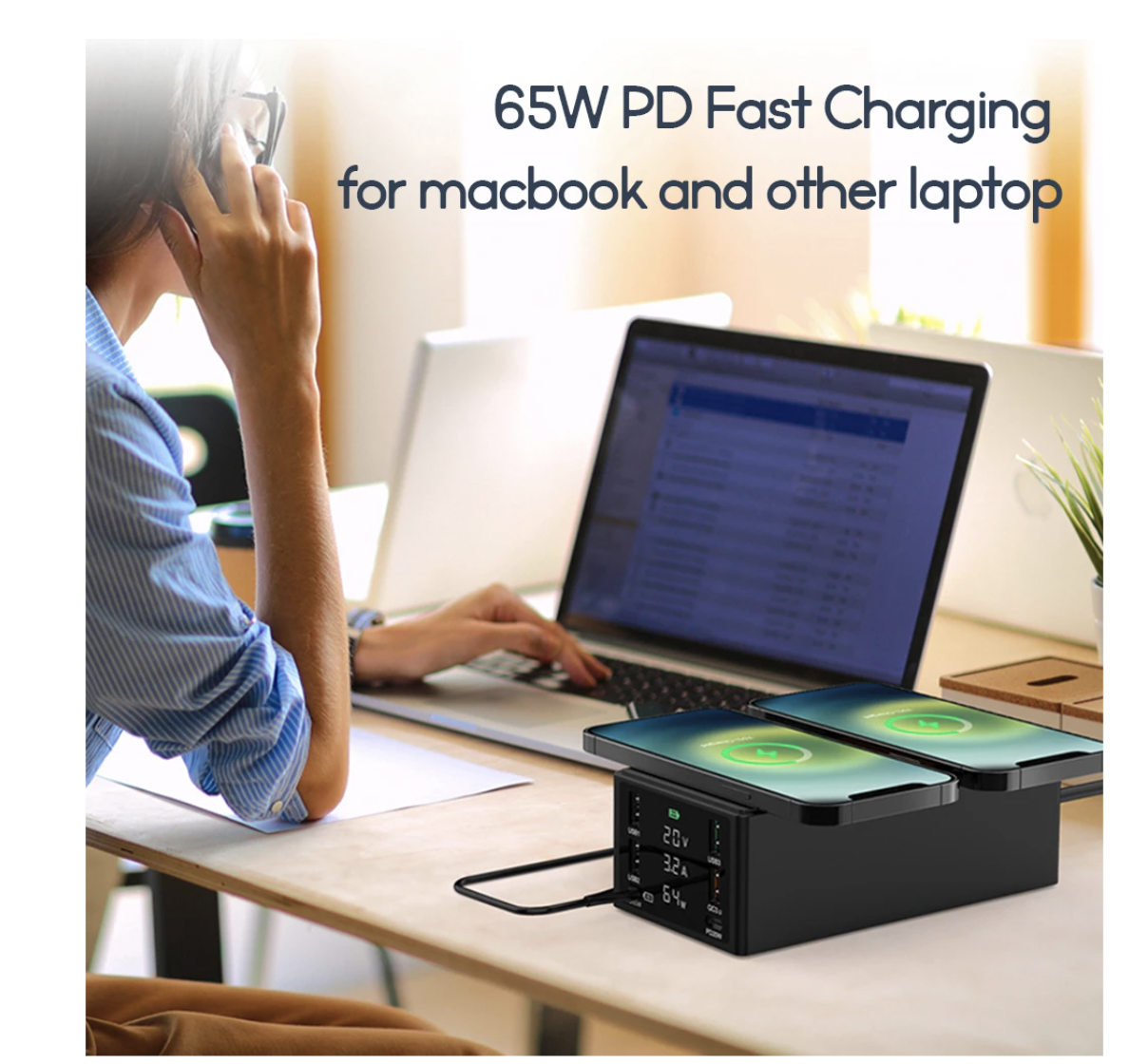 Parametri: 1. Culoare: Negru, Alb 2. Intrare: 100-240V 50/60Hz 3. Putere totală: 150W (MAX) 4. PD65W: 5V3A 9V2A 12V3A 15V3A 20V3.25A 5.V5.25A 5.V5.25A. 3A 20V3.25A 5. PD65W: 5V2.20A 5. 6. Ieșire QC3.0: 5V3A 9V2A 12v1.5A 4.5V5A 5V4.5A 7. Încărcare fără fir: 2*15W, compatibil cu.05W5W5 WA 9. Lungimea cablului de alimentare: 1012M . .Dimensiune încărcător: 160*80*55MM