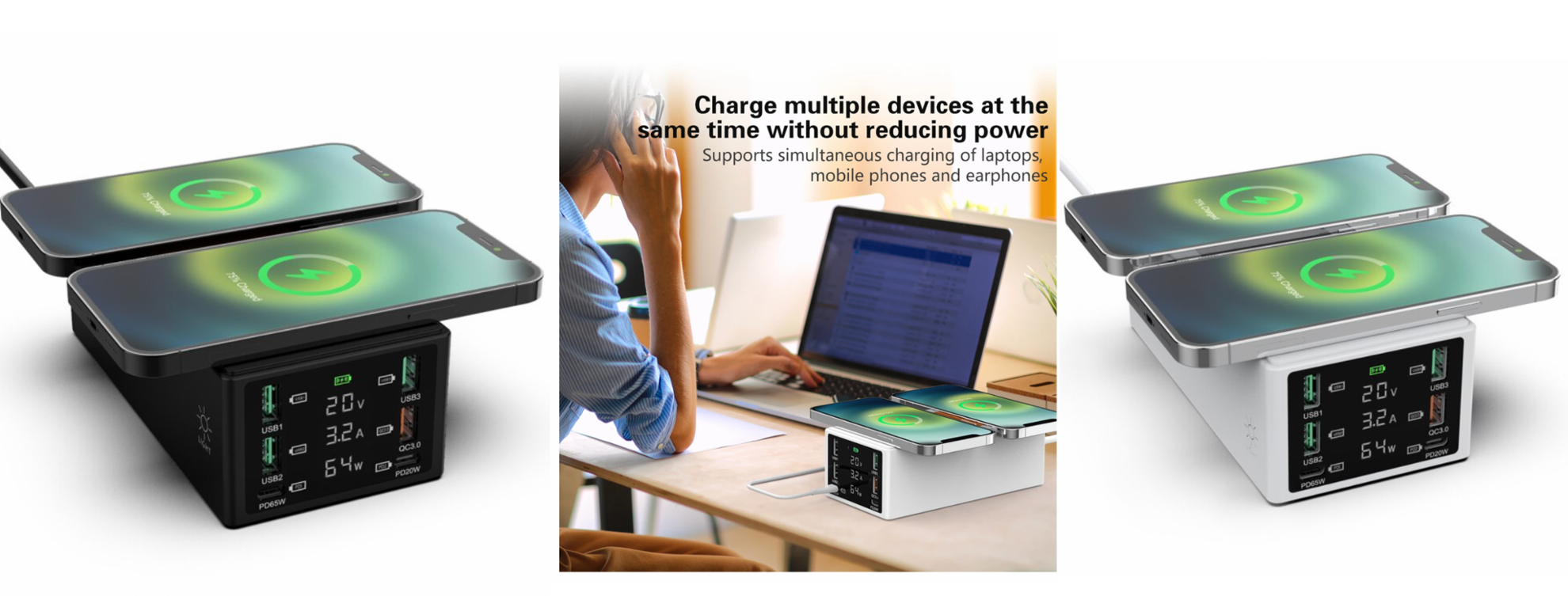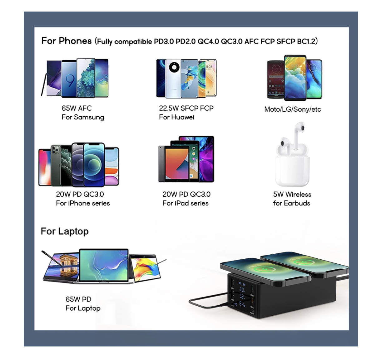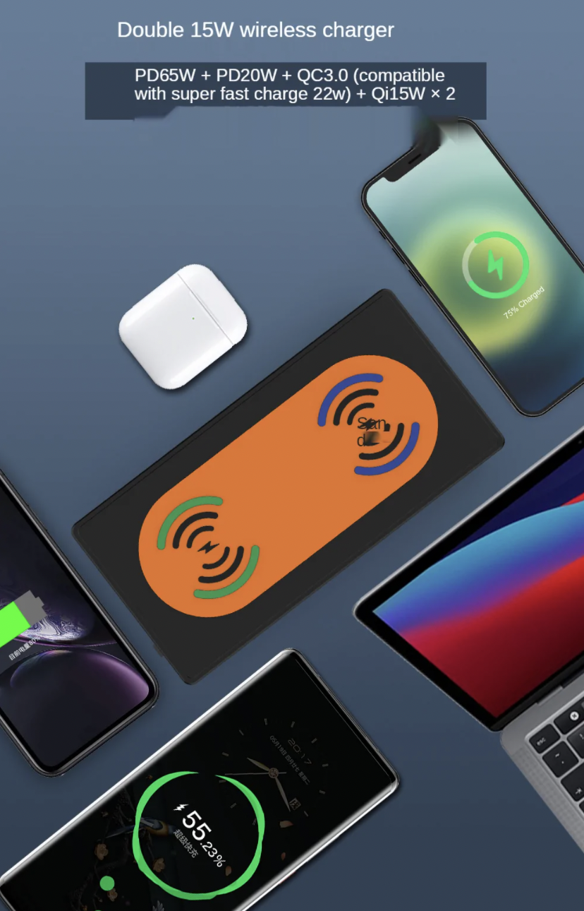Parametri: 1. Culoare: Negru, Alb 2. Intrare: 100-240V 50/60Hz 3. Putere totală: 150W (MAX) 4. PD65W: 5V3A 9V2A 12V3A 15V3A 20V3.25A 5.V5.25A 5.V5.25A. 3A 20V3.25A 5. PD65W: 5V2.20A 5. 6. Ieșire QC3.0: 5V3A 9V2A 12v1.5A 4.5V5A 5V4.5A 7. Încărcare fără fir: 2*15W, compatibil cu.05W5W5 WA 9. Lungimea cablului de alimentare: 1012M . .Dimensiune încărcător: 160*80*55MM