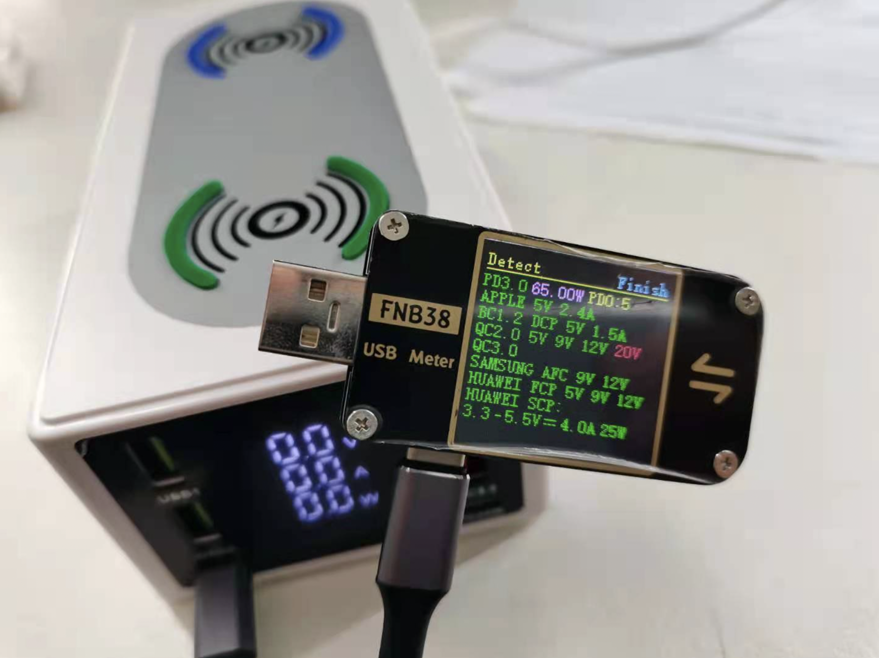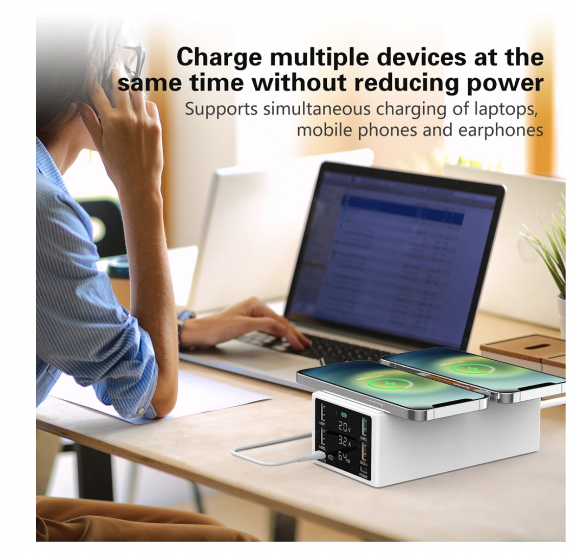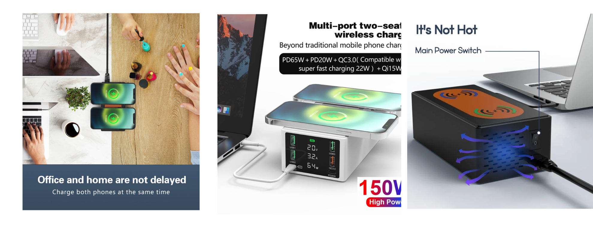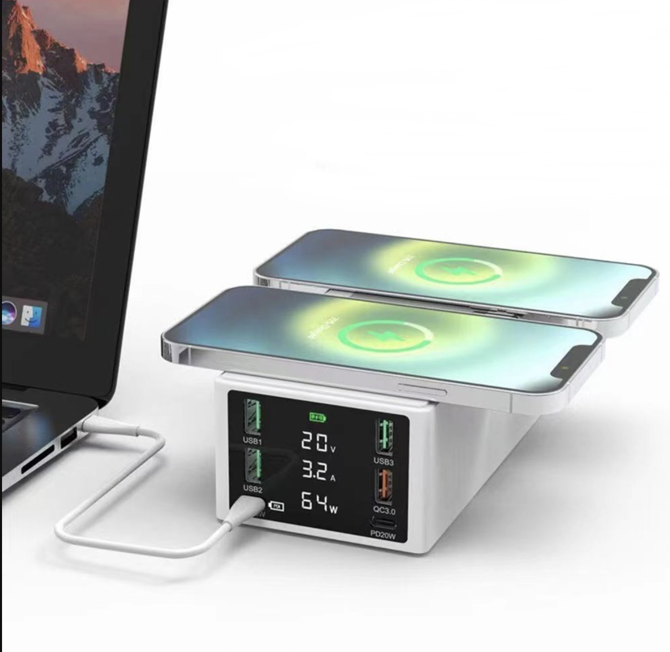 Parametri: 1. Culoare: Alb 2. Intrare: 100-240V 50/60Hz 3. Ieșire totală: 150W (MAX) 4. PD65W: 5V3A 9V2A 12V3A 15V3A 20V3.25A 5.6A95V 3.5V 5.6A95V 3. PD65W: 9V20.A6V2 . Ieșire QC3.0: 5V3A 9V2A 12v1.5A 4.5V5A 5V4.5A 7. Încărcare fără fir: 2*15W, compatibil cu 10W 7.5W 5W 8. Ieșire USB: 3*2.4A 9. Lungimea cablului de alimentare Dimensiune: 160*80*55MM