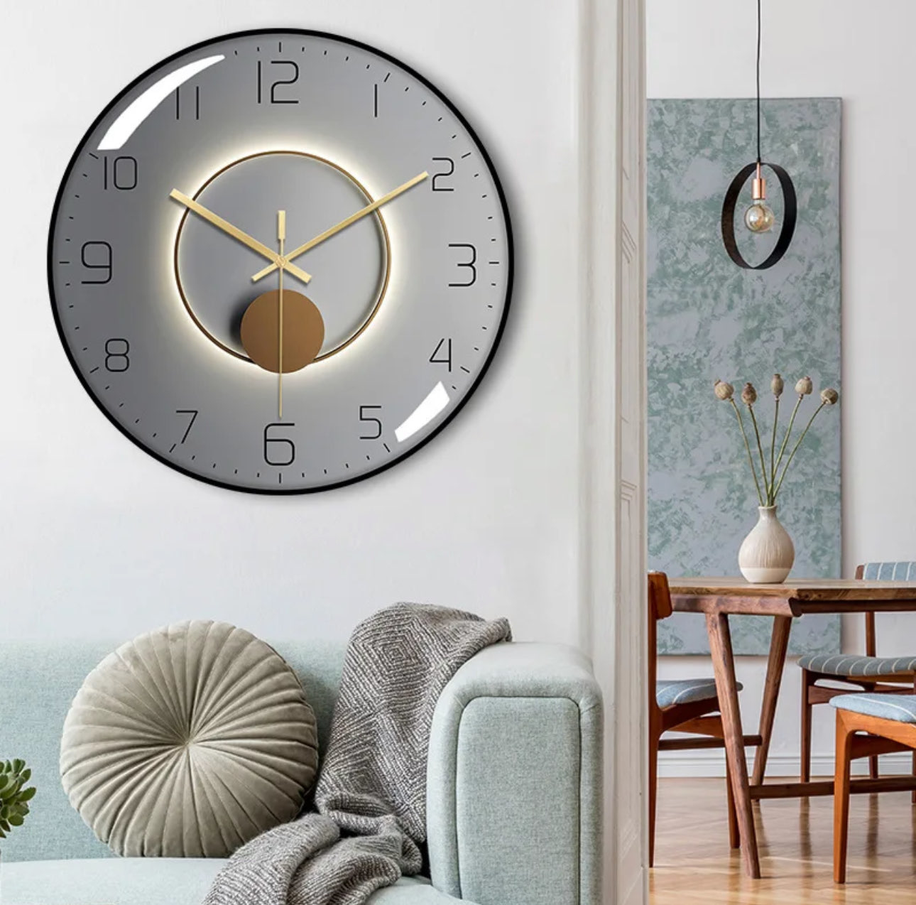 Perfect pentru decorare; Ceasul de perete FGHHJ folosit pentru decorarea camerei de zi are trei dimensiuni: 12 inchi, Puteti alege dimensiunea potrivita in functie de dimensiunea camerei. Acest design creativ modern va imbraca perfect decorul oricarei ocazii, cum ar fi camera de zi, bucatarie, dormitor, casa, birou, sufragerie etc.* Timp precis si ultra-linistit Miezul de maturat cu cuart asigura un timp precis. Ceasul de perete este absolut silentios, indicatorul se roteste lin, iar performanta este stabila. Agatat pe peretele dormitorului sau al biroului nu va va afecta odihna sau munca. Potrivit pentru orice loc unde este nevoie de un mediu linistit.* Material Cadru din PVC de inalta calitate, cadran de ceas din lemn, cadran de ceas din sticla si ac metalic. Design ultra-subtire, stil inovator, elegant si frumos. Acesta este un ceas de perete art deco foarte potrivit pentru camera de zi.* Usor de utilizat si alimentat de la baterie Cu un design unic al slotului din spate, puteti agata cu usurinta ceasul orizontal pe perete folosind un cuie care nu marcheaza in accesoriile de instalare. Alimentat de o baterie AA (nu este inclusa in pachetul de livrare).