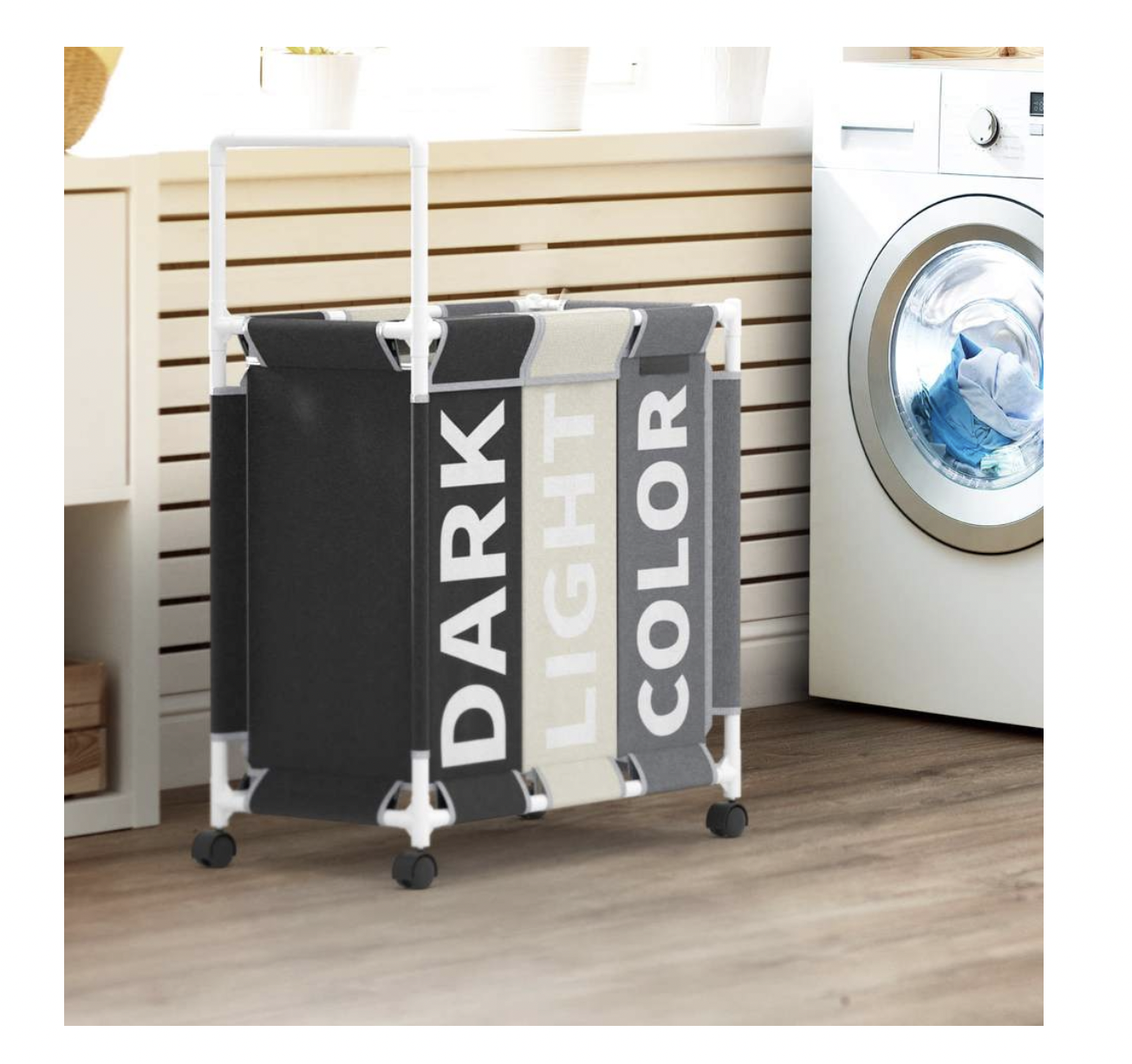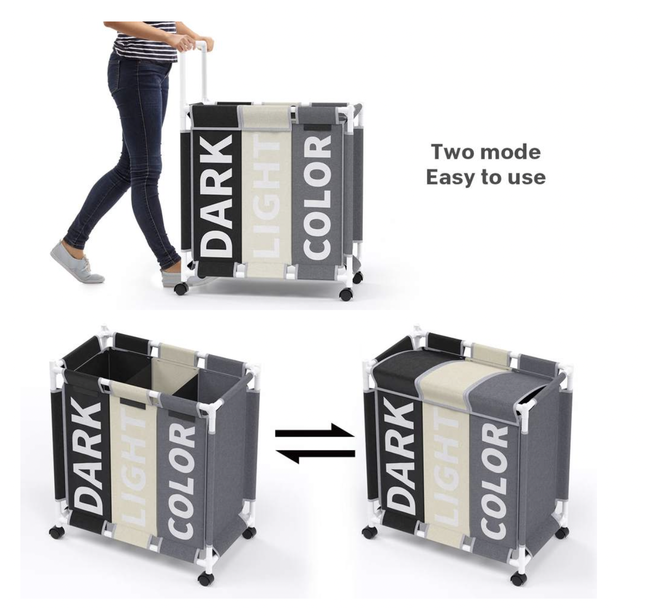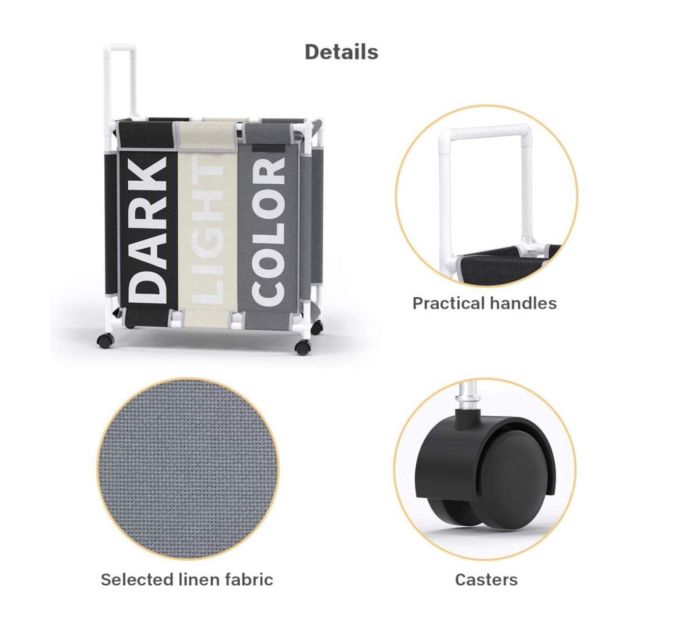 Cos pentru rufe cu roti QUANDEXL, din material textil, 3 compartimente, Negru, Alb, Gri, 90,4 X 60,9 X 35,5 cm, 160l