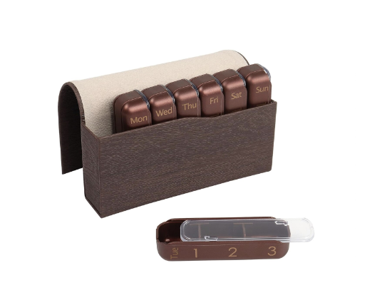 Cutie organizator medicamente Deluxe, QUANDES®, 7 zile, 28 compartimente, geanta suport, 12x8x3cm, marou, PU piele