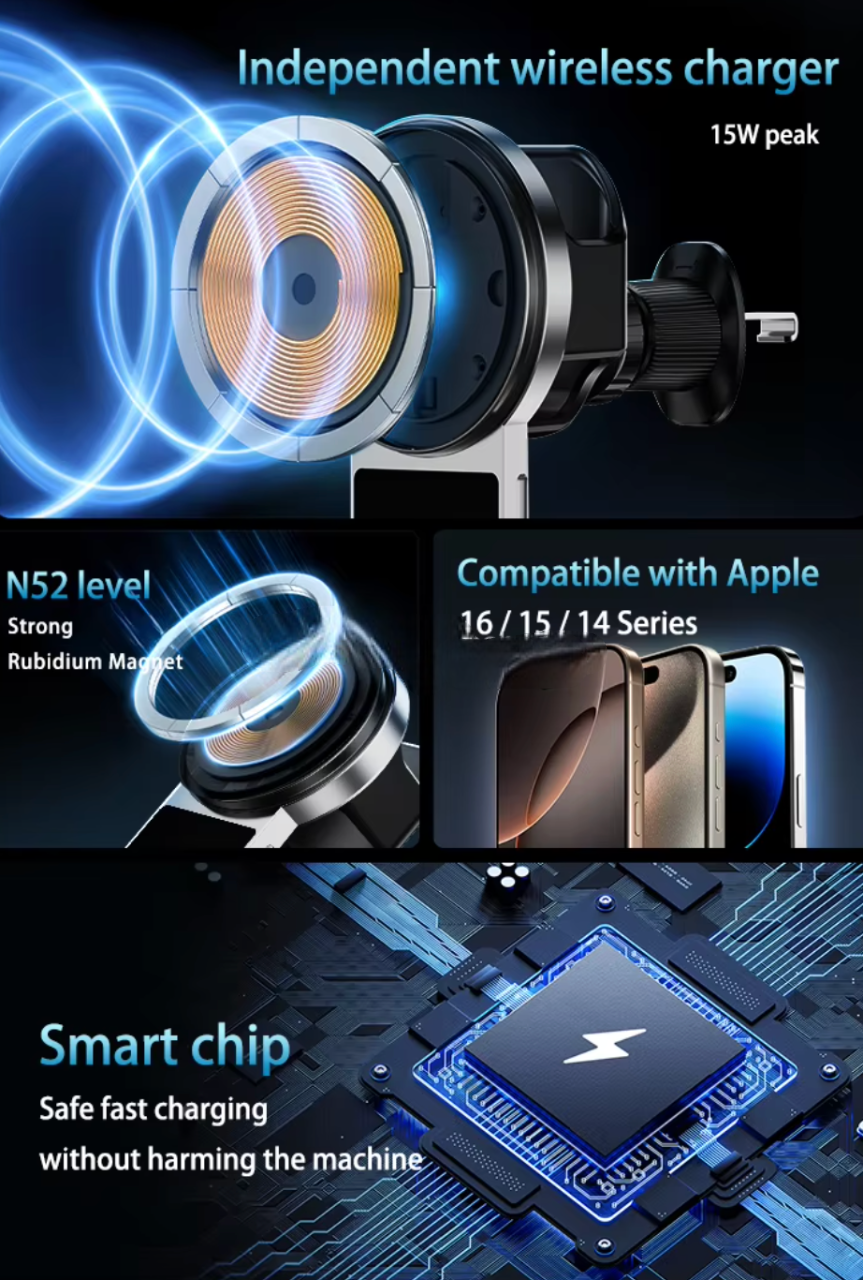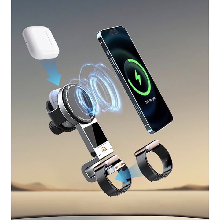 Incarcator auto wireless 3 in 1 de 15w pentru Apple Watch S10 pentru Airpods Pro 2, statie de incarcare, suport magnetic pentru telefon auto pentru iPhone 17/ 16/ 15/ 14/ 13/ 12 pro max