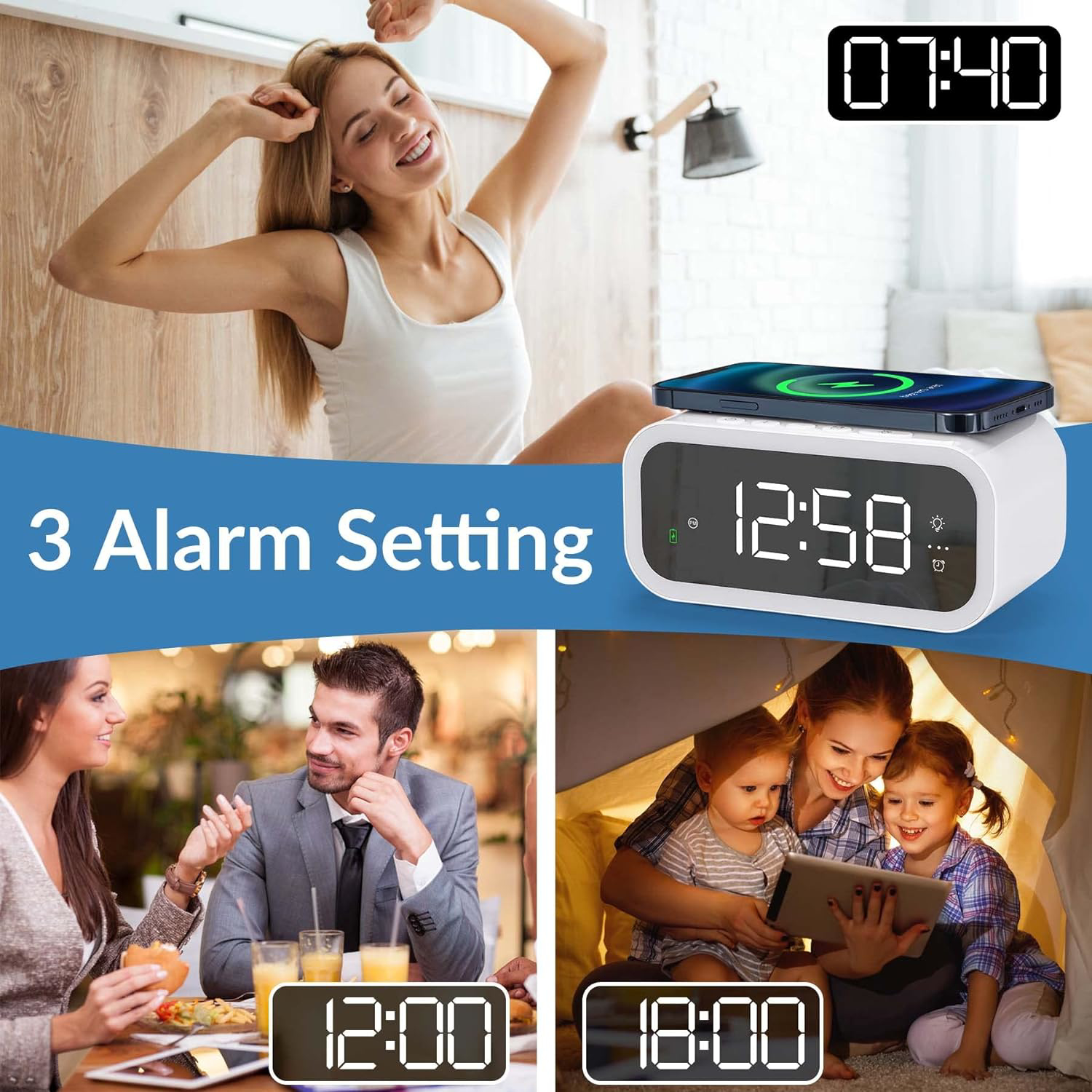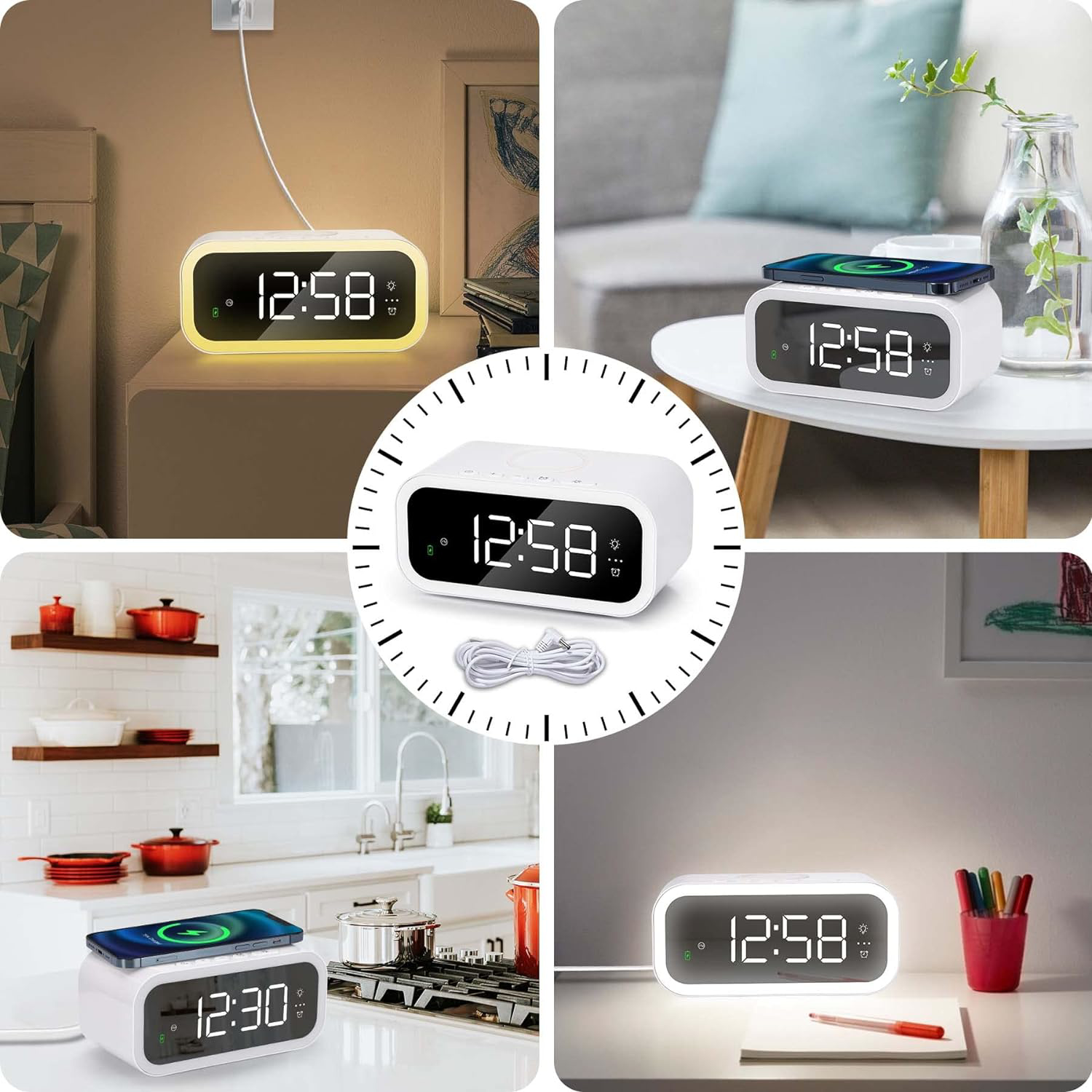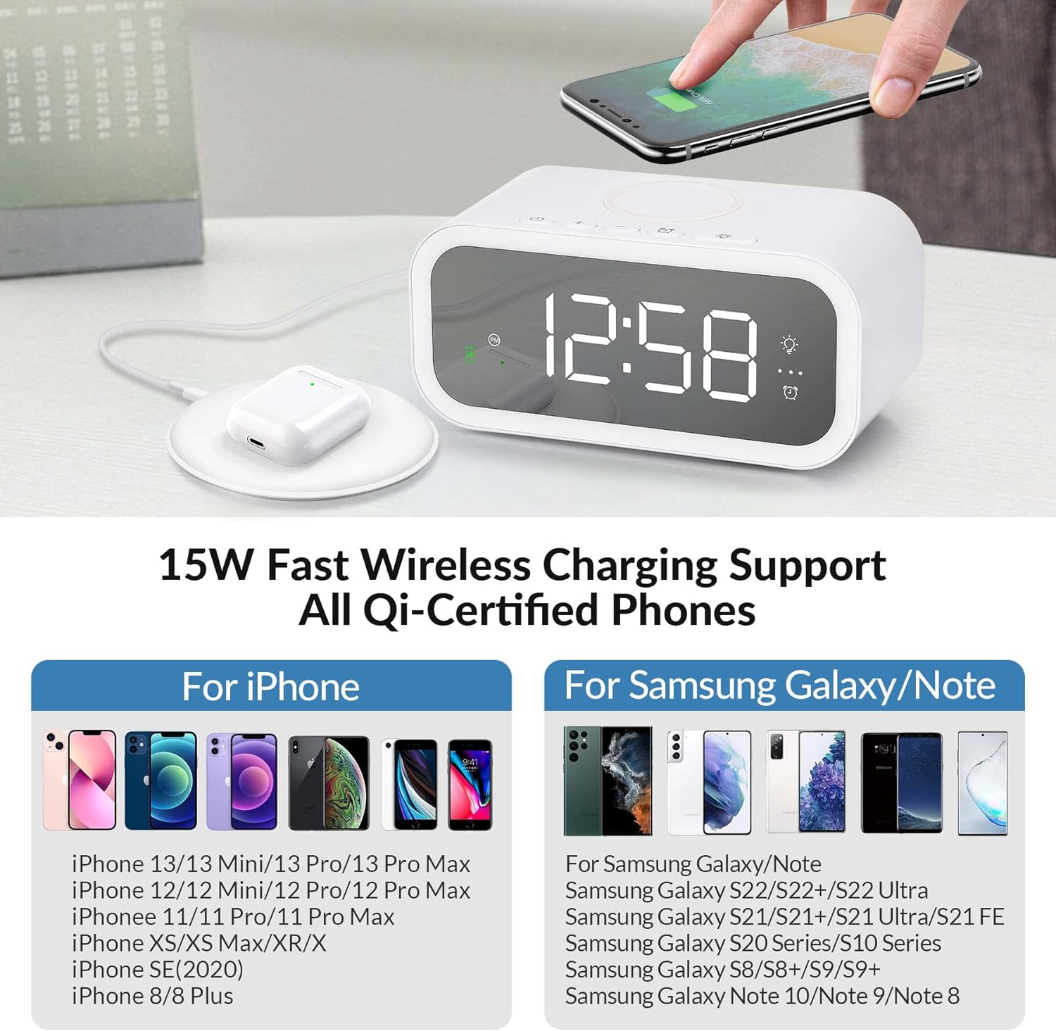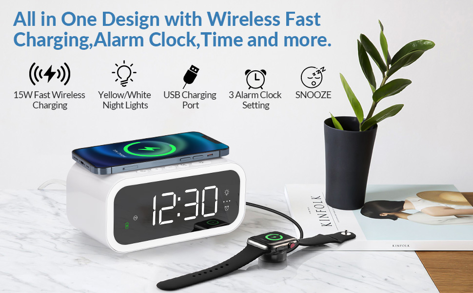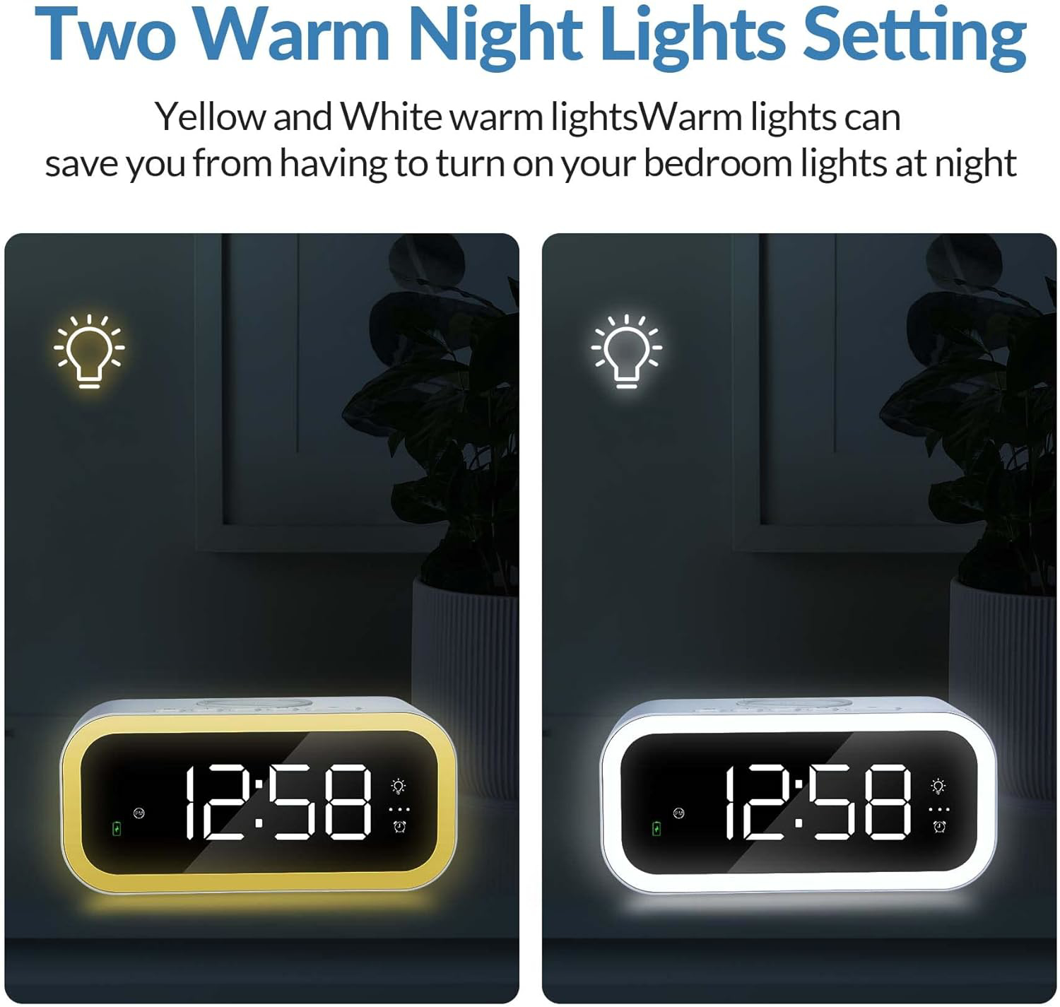Specificatii: 1. Setare ceas 24/12 ore, calendar perpetuu incorporat 2. 3 grupuri de setari ale ceasului cu alarma de memorie (puteti seta un ceas cu alarma, doua ceasuri cu alarma sau trei ceasuri cu alarma in acelasi timp) 3. Accepta incarcare rapida, incarcare rapida fara fir si interfata de incarcare rapida USB cu fir (incarcarea fara fir este acceptata si de alte dispozitive electronice, in afara de telefoanele mobile). 4 mod de lumina de noapte, lumina rece/lumina calda poate fi comutata cu un singur buton, iar luminozitatea luminii poate fi reglata continuu 5. Modul Amanare, apasati orice tasta pentru a amana timp de 5 minute dupa ce suna