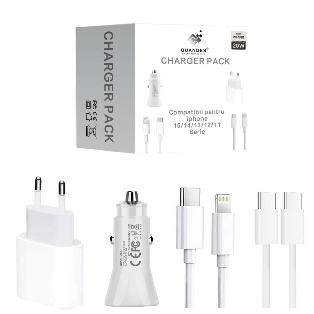 Pachet 4 buc Incarcator Fast Charge 20W usb C, pentru iPhone 15pro, 14, 13 12 Pro Max, 1 Cablu de date USB-C - C, 60w, USB-C Lightning, 37w, Adaptor auto USB-C, 20W