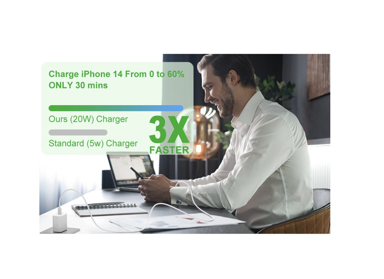 Fisa USB C iPhone de 20 W: mufa USB C de 20 W ofera o viteza de incarcare mult mai rapida pentru iPhone si iPad, dispozitivul poate fi incarcat de la 0% la 50% in doar 30 de minute, de 2,5 ori mai rapid decat adaptorul traditional 5V/3A.