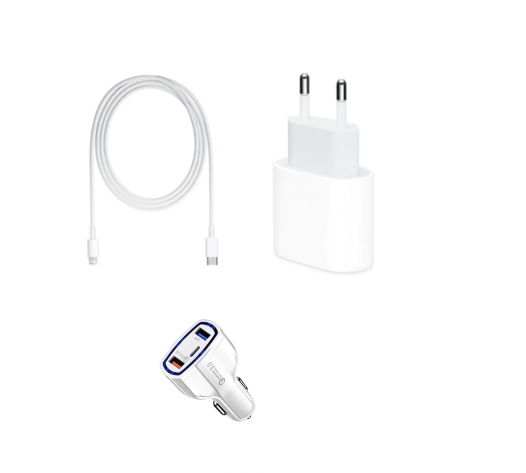 Pachet, caricabatterie Fast Charge Apple de 20 W pentru iPhone 14,13,12 Pro Max + date Type-C-Lightning de 2 m + adaptator pentru auto rapid de 7 A