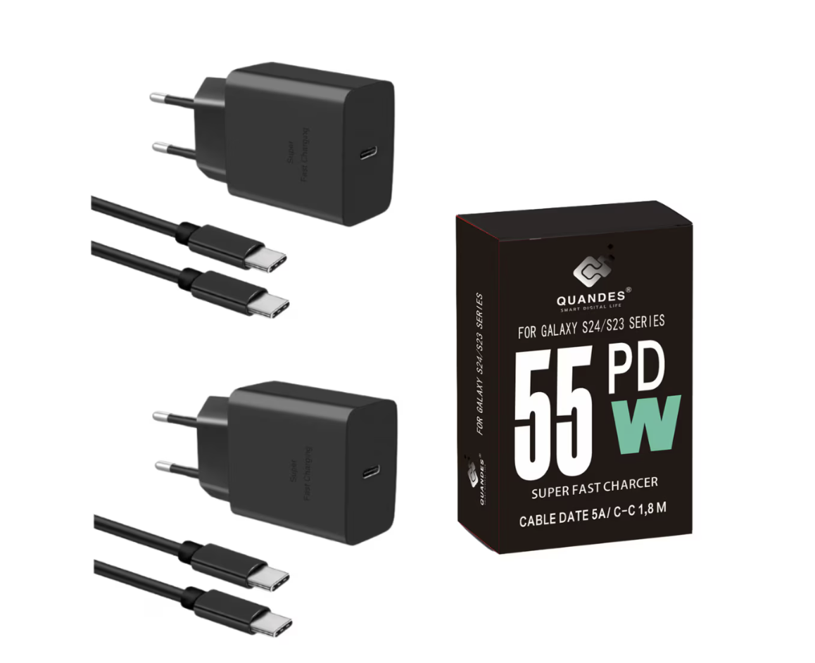 Set 4 buc Incarcator super Fast Charge 2buc, 55W PD GaN, usb C, T4510 compatibil cu Samsung S25, S24, S24 ultra, 2 Cablu de date 1.8m USB-C - C 5A