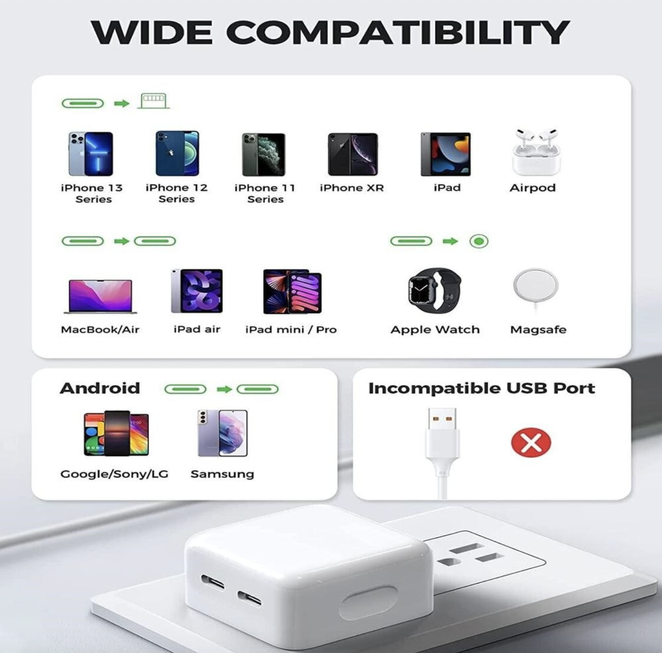 incarcator rapid de 40W Incarcator de perete PD 3.0 USB C iesire port de incarcare rapida 40W(max), de 5X mai rapid decat incarcatorul 5V2A, Incarca iPhone 13 Pro max de la 0% la 65% in doar 30 de minute, Incarca iPad Air4 de la 0 % pana la 55% in doar 30 de minute. (Nota: cand doua porturi se incarca in acelasi timp, impart fiecare 20 W. Iesire cu doua porturi Cu 2 porturi de tip C, acest bloc de incarcare pentru iPhone va permite sa incarcati doua dispozitive simultan, o modalitate mult mai eficienta de a va incarca telefonul, iPad-ul sau Apple Watch in acelasi timp.