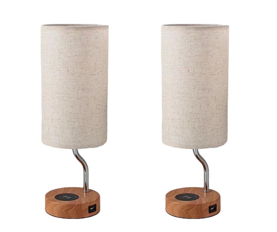 Set Lampa cu abajur din tesatura, pentru birou, dormitor, cu incarcare wireless telefon Android si iOS, QUANDES®, 2 porturi USB-A/C, crem