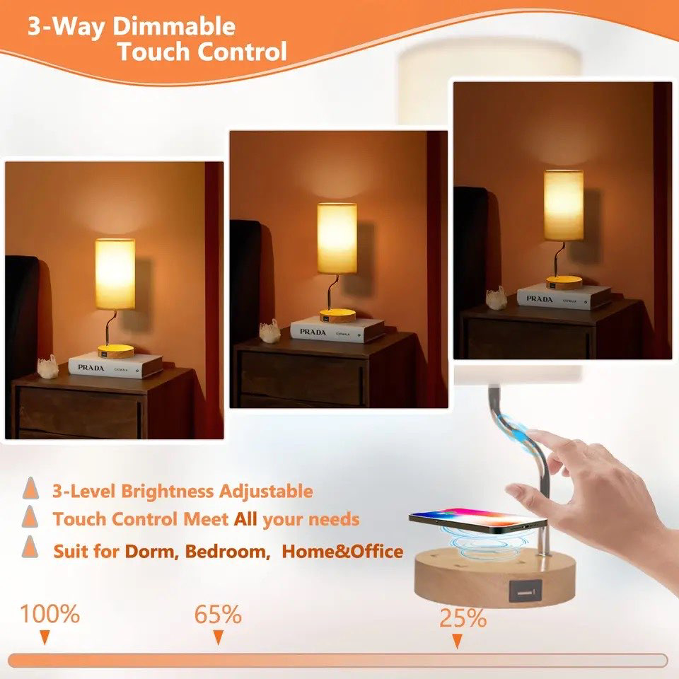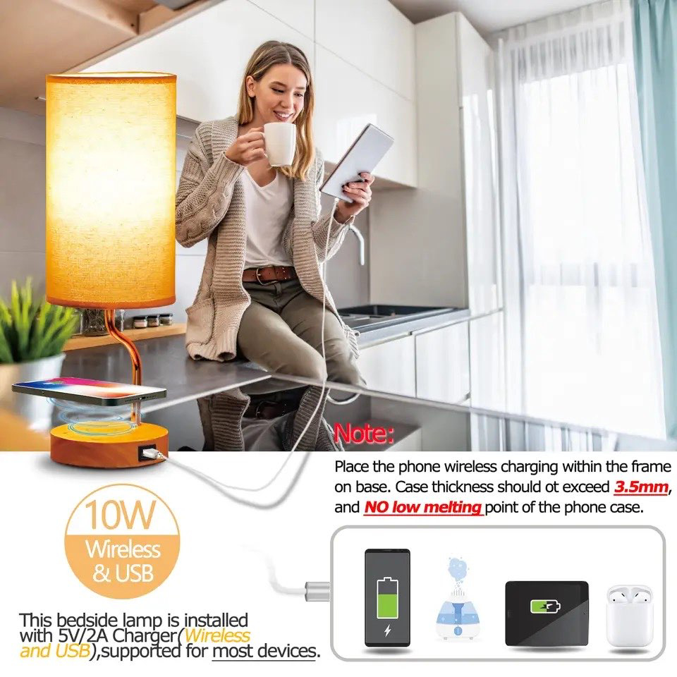 Lampa cu abajur din tesatura, pentru birou, dormitor, cu incarcare wireless telefon Android si iOS, QUANDES®, 2 porturi USB-A/C, crem