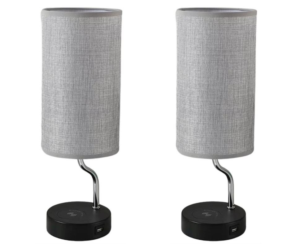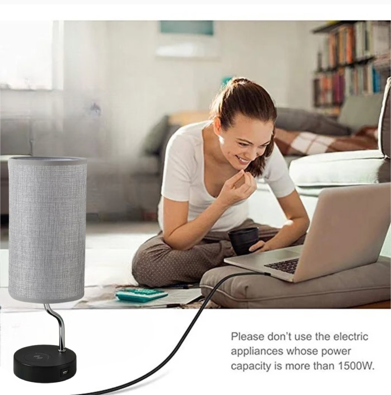 Set Lampa cu abajur din tesatura, pentru birou, dormitor, cu incarcare wireless telefon Android si iOS, QUANDES®, 2 porturi USB-A/C, negru