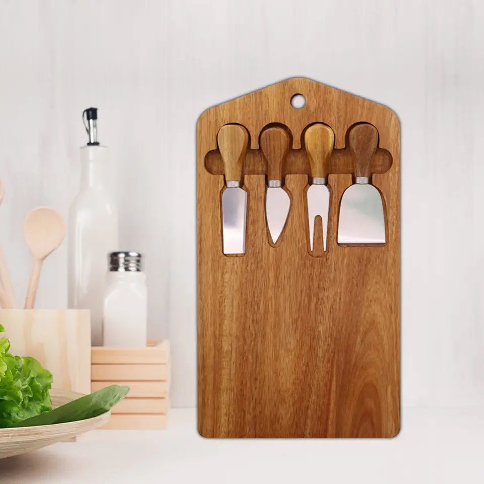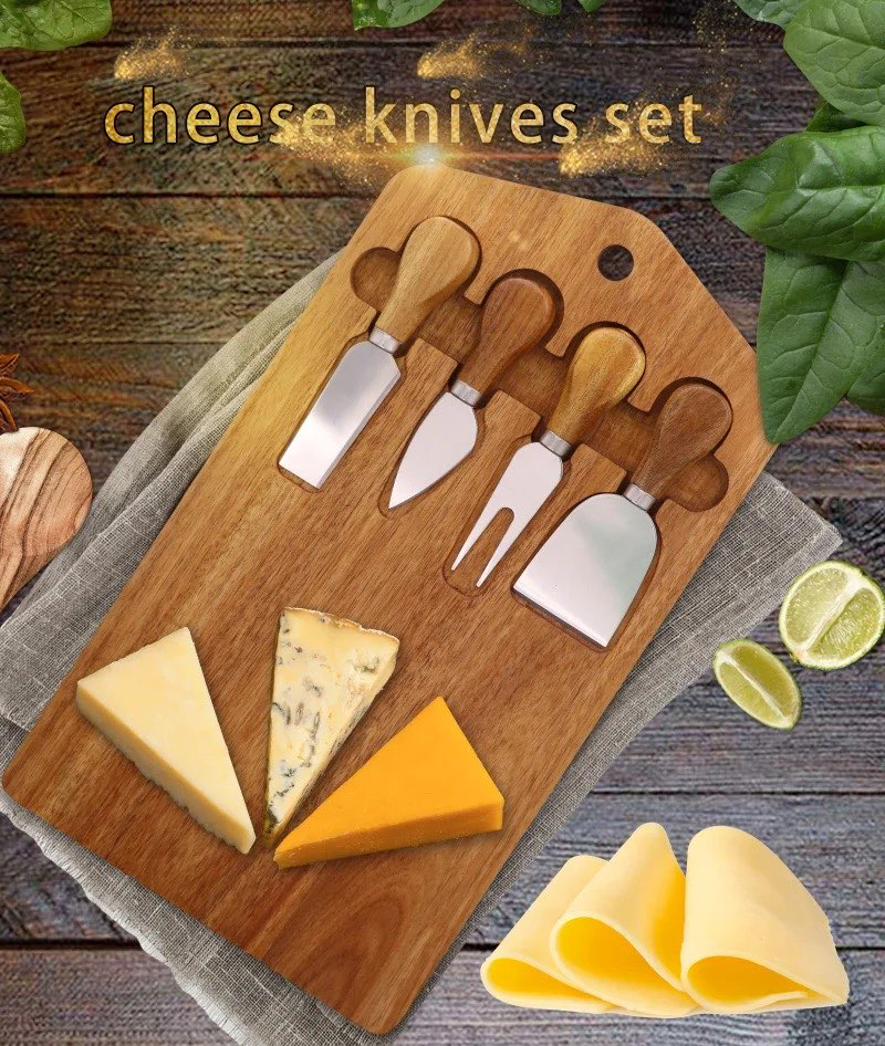 Set pentru servire branzeturi si aperitive 4 ustensile si platou,36 x 23 cm, lemn