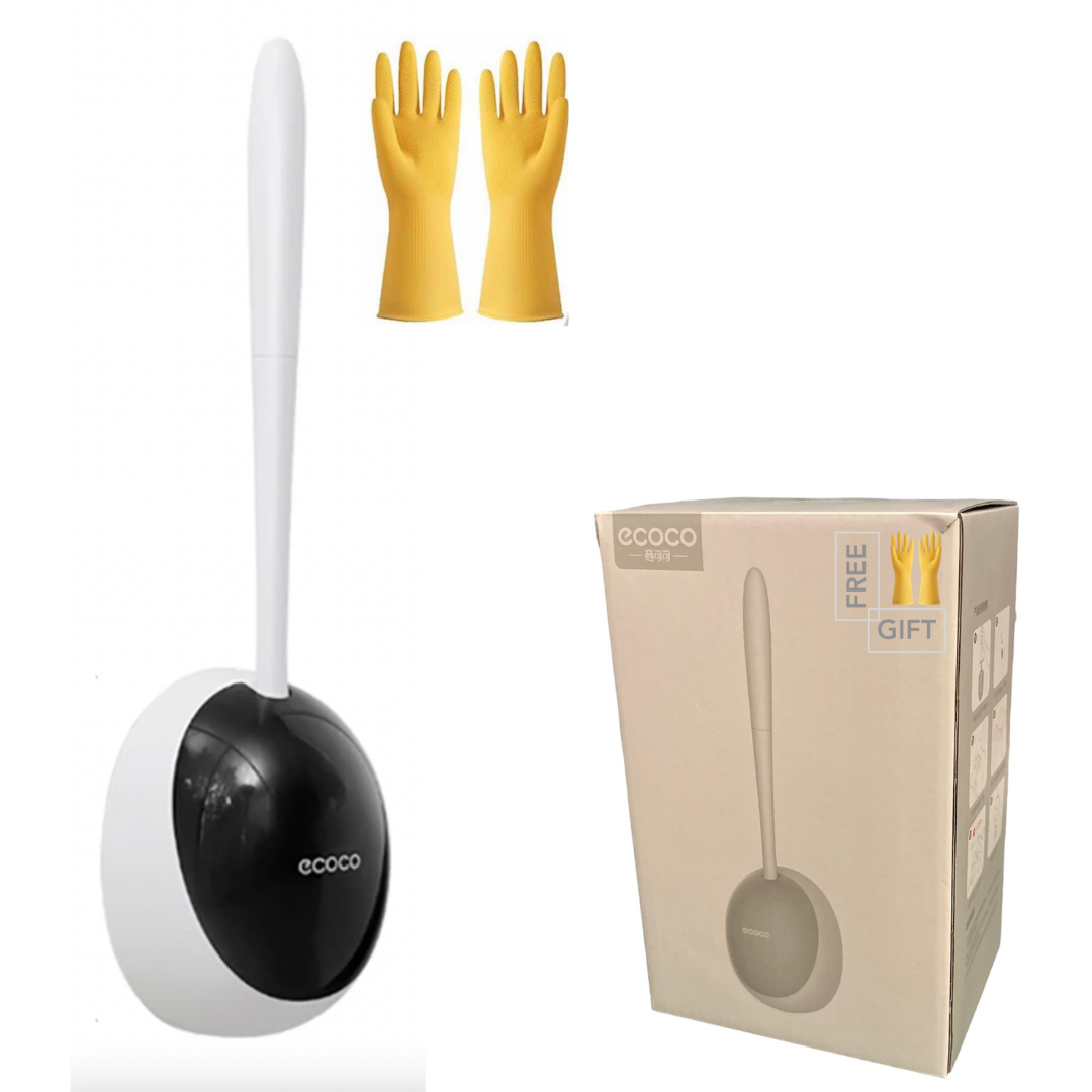 Set Perie de silicon pentru toaleta cu suport din plastic, ECOCOXS, include manusi, Alb, negru