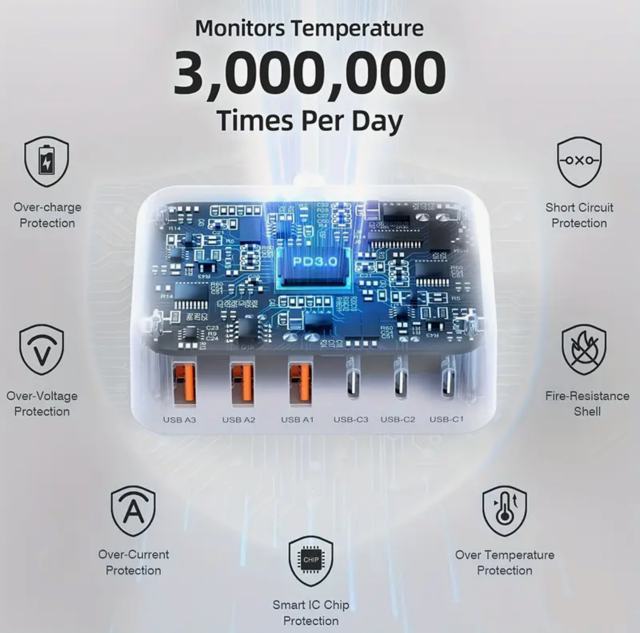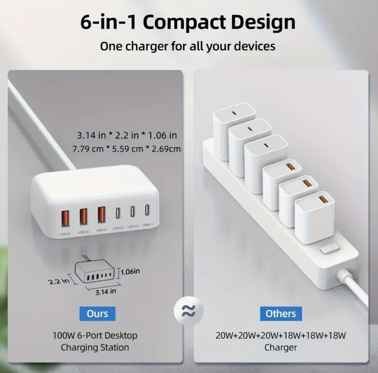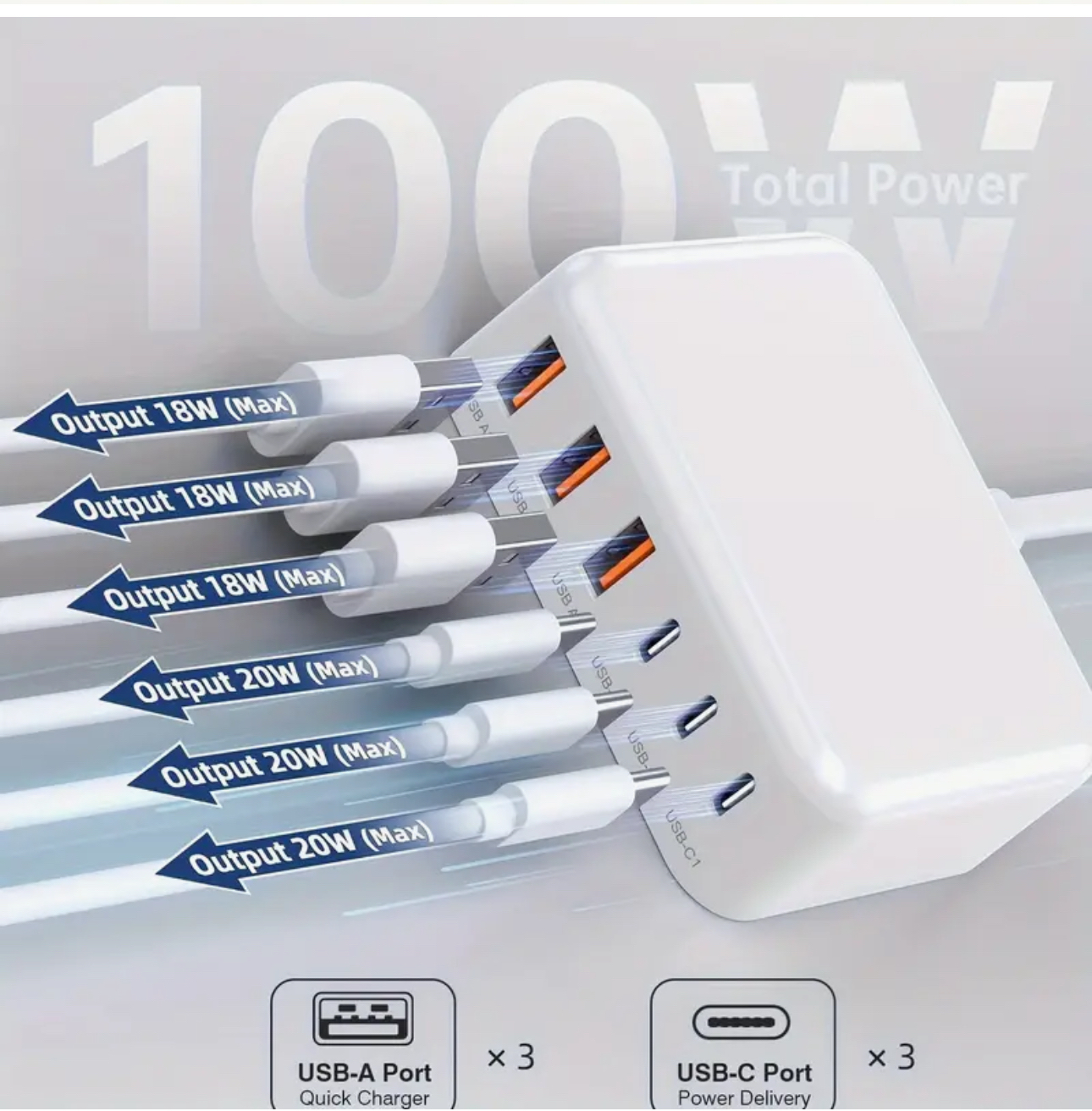 * —Echipat cu 3 porturi USB-C si 3 porturi USB-A, se mandreste cu o compatibilitate remarcabila. Poate fi adaptat cu usurinta la dispozitivele mainstream de pe piata, inclusiv iPhone-uri, seria Samsung Galaxy, iPad-uri, telefoane Google Pixel, ceasuri Apple, precum si diverse incarcatoare wireless. Un singur incarcator inlocuieste mai multe incarcatoare, astfel incat nu mai trebuie sa aveti o gramada de incarcatoare atunci cand iesiti in oras.