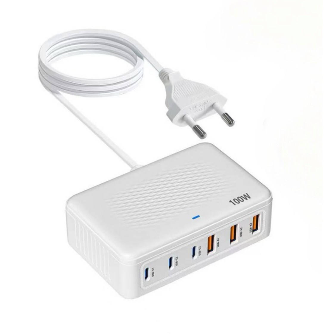 Statie de incarcare rapida cu 6 porturi GaN de 100W, Incarcator USB C, pentru dispozitive multiple, adaptor de alimentare cu priza pentru toate iPhone 16 15, 14, 13, iPad Samsung, Android, Alb